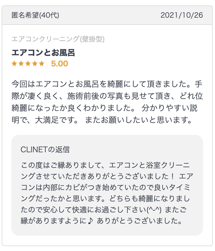 大手ハウスクリーニング会社で培った確かな技術で、自分では落とせない頑固な汚れもCLINETにお任せください! 特に水回りの清掃に自信があります。浴室、トイレ、洗面台の陶器類やキッチンシンクなど、他社では落とせない汚れを驚きの仕上がりで解決します。